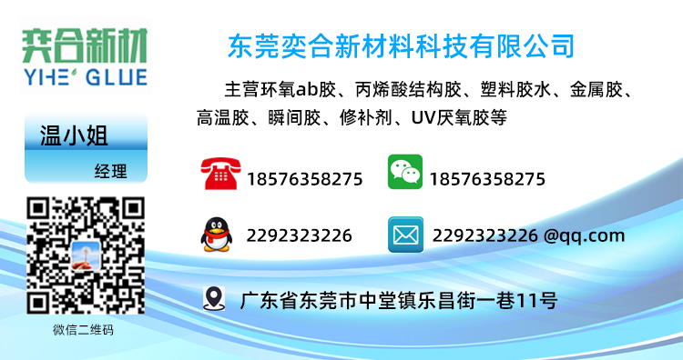 东莞奕合新材料科技有限公司是东莞一家集科研、生产、销售于一体的现代化胶粘剂企业。一直以来,公司本着服务客户的原则,全心致力于开发高性能强力胶水。在如今充满竞争的市场上,我们以其能力和灵活性对新挑战做出快速反应,研发了当今可用的技术先进的产品系列,包括高温胶水、快干胶水、瞬间胶水、UV胶水、修补剂、金属胶水、塑料胶水、厌氧胶水、密封胶水、环氧ab胶水、紫外线光固化胶等等,实现了胶粘剂系列产品覆盖,如果您遇到了您解决不了的粘接难题,您可以联系我们,我们奕合技术团队会帮您解决,进行一对一的专业服务请拨打技术固定电话:0769-8812-0530 温S18576358275 联系技术人员免费提供样品,免费为您试样和提供解决方案,期待您的莅临合作!奕合新材官网//m.motcomms.com/期待您随时的来电